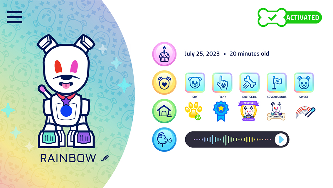 As soon as you uncrate this pup, the minting process begins, revealing a unique combination of colorful lights, sounds and personality traits. Dog-E moves and sounds like a real dog with a cute forward run, wagging tail and over 200 sounds and reactions.