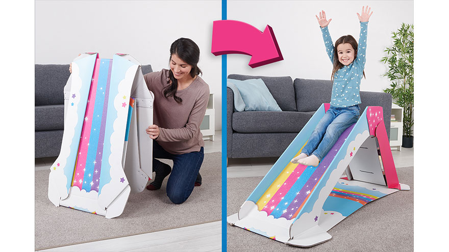 Parents can assemble these pop-up playsets in less than five minutes and fold them flat for easy storage. Each set is made with a durable, eco-friendly, StrongFold cardboard material that can hold up to 50 pounds. These playsets will be available in the spring.