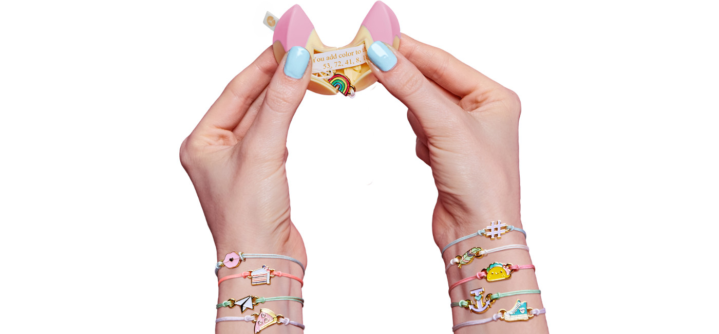 Surprise Lucky Fortune charm bracelets come with a matching paper fortune, inside a fun toy fortune-cookie-shaped package. Crack yours open to find out what's inside!