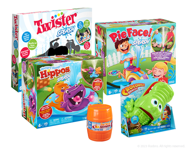 Make a splash with your favorite family games reimagined for outdoor play. Get drenched with new Splash Games titles: Monopoly, Hungry Hungry Hippos, Pie Face, Twister JR, Battleship, and Barrel of Monkeys. These new additions join Twister Splash, Operation Splash, and Crocodile Dentist Splash. Connect your hose and dive into action for hours of summer fun!
